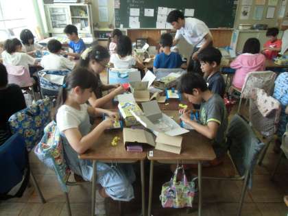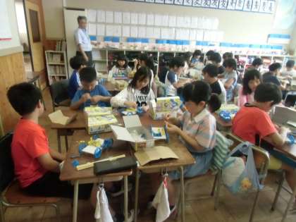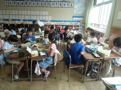 4年理科「電気のはたらき」 モーターを速く回すにはどうしたらよいか?電池を増やすという予想を立てて、どんなつなぎ方をするか、いくつかの回路を話し合い、実験しました。