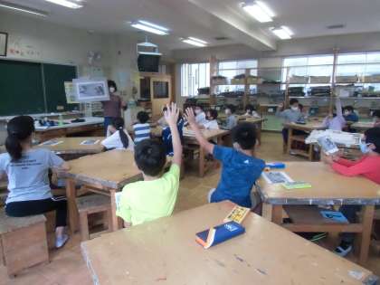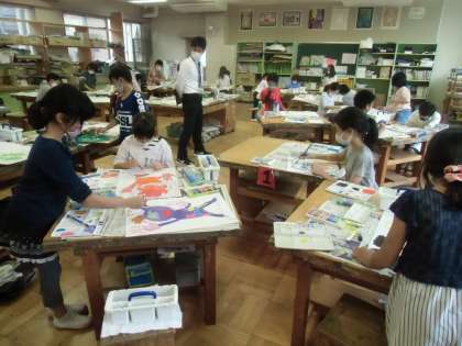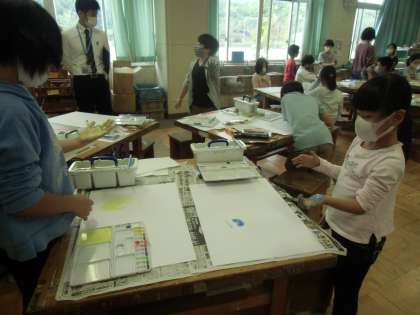 4年図画工作科「マイ風神雷神」 白黒の風神雷神の絵をみて、ポーズをとってみて、自分の手形から、自分の風神雷神を描き始めました。色や形を工夫しながら制作していました。