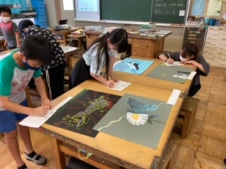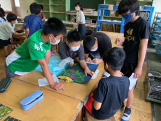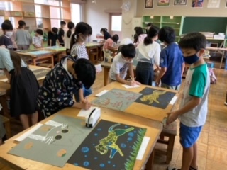 6年図画工作科「ドットアート」 作品の鑑賞会でした。点だからこそできる表現やそれぞれのイメージにあった色合いの良さや美しさを感じとっていました。