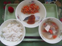 今日の給食は、炭水化物と鉄、ビタミン類がたっぷりの献立です。