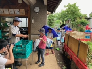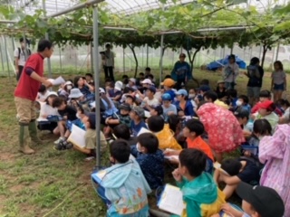 中西ファームで、野菜の生産についてお話を聞きました。雨が降ってきたので、収穫体験はできませんでしたが、一人一人ジャガイモをいただきました。