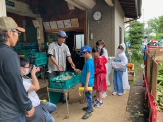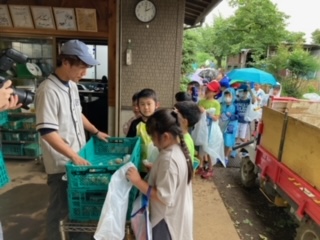 中西ファームで、野菜の生産についてお話を聞きました。雨が降ってきたので、収穫体験はできませんでしたが、一人一人ジャガイモをいただきました。