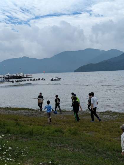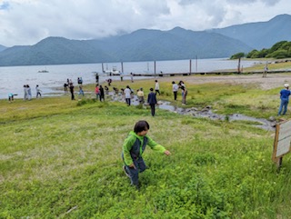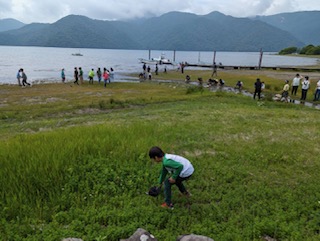 龍頭の滝から中禅寺湖までのハイキングです。菖蒲が浜では、カエル,カマキリ,魚を見つけました。