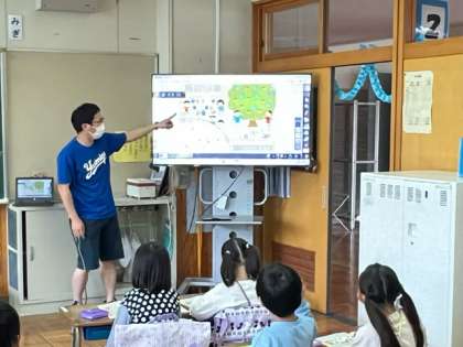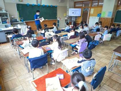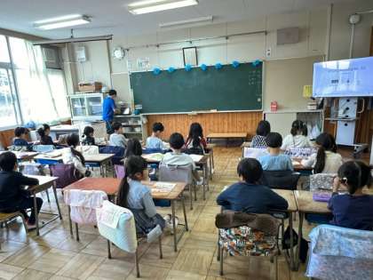 1年2組では、ICTを使いながら、朝の学習を行っていました。低学年では、教科書と同じ画像を見ながら学ぶことはとても有効です。みんな、意欲にあふれています。