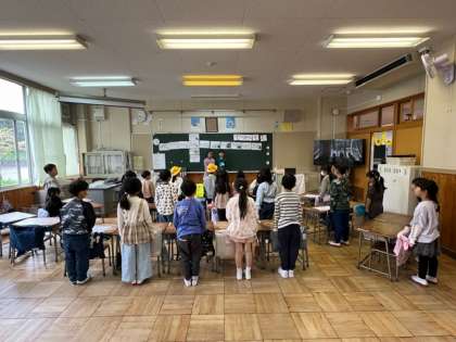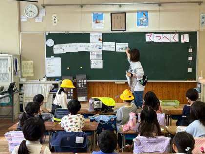 1年3組では、もう日直さんが前に立って朝の会をしていました。みんな、日直さんや先生の話をしっかりと聞いています。黒板に貼ってある紙には朝やっておくことが書かれています。それを見ながら、できているかみんなで確認していました。
