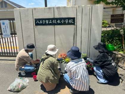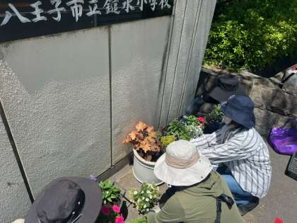 鑓水小学校の校門をはじめ、様々なところのお花を植えたり管理してくださっているのが「おはながかり」さんです。