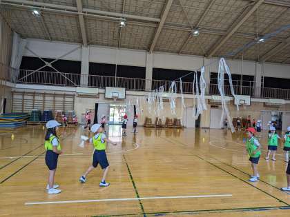 マシュミントンと名付けたゲームをしています。マシュマロみたいなボールを投げ合い、バドミントンのように相手コートに落としたら得点できます。