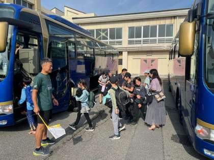 大型バスが3台このように並んでとめられる鑓水小学校の駐車場、すごいです。このような学校はそうはありません。