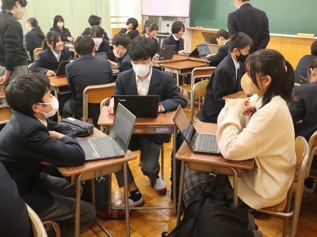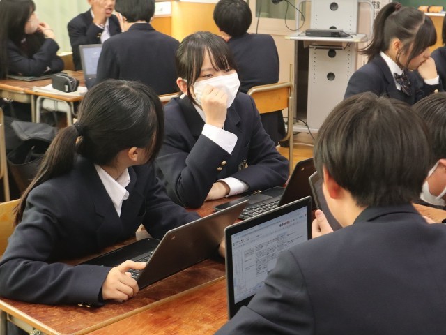 「いじめはなぜ起きるのか」というテーマで「対話」しました。生徒会本部役員や学級委員、班長等が共感度に応じてリアクションをとったり、対話を深める言葉と使ったりして、さまざまな視点にたって結論をまとめました。これははちおうじっ子サミットの取組でもあります。参加した生徒は「『そもそも~』をつかうと、話がずれていても修正できた。」「『なぜ?』と理由を聞いたことで、意見自体は納得できなかったが、理由については共感できた。」等の感想を話していました。