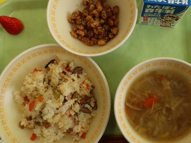 今日の給食は つみれ汁・大豆の揚げ煮 です。