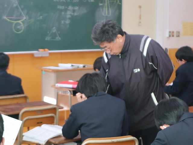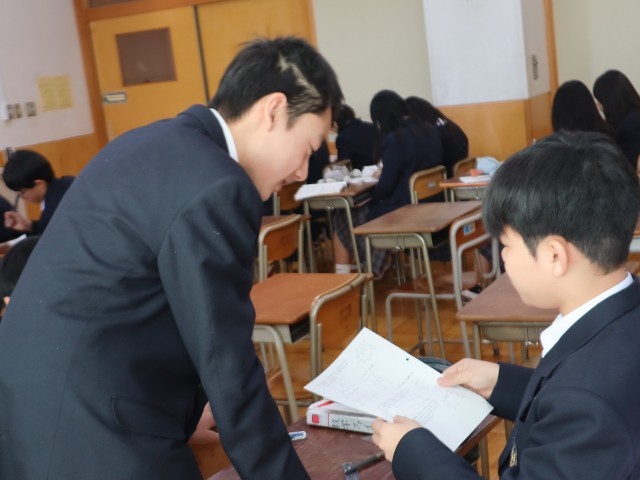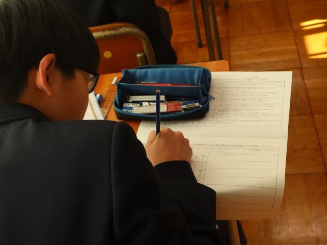 立方体や直方体に糸をかける問題で、その最短距離を求める問題が中心問題(この授業内で理解する問題)でした。例題を先生が説明した後、この授業の目標を、「中心問題を理解する」「中心問題を他者に教えることができる」「応用問題を解くことができる」等、それぞれの理解度に合わせて設定をし、それぞれの進度で取り組んでいました。振り返りもしっかりとできていました。