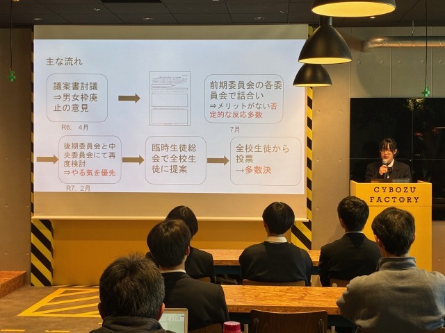 生徒会本部役員の有志が「ルールメイキング関東児童生徒大会・交流会」に参加してきました。「ルールメイキング関東児童生徒大会・交流会」は校則の見直しに取り組む児童・生徒が集い、お互いの気づきを共有して学び合うイベントです。生徒会本部役員は、「委員会の男女枠の撤廃」「インナーや靴下の色の指定をなくす」等の実践と「ルールを変えた背景や意義について、全校生徒の理解が深まらない」という課題を発表しました。※鑓水中学校は実践発表した5校のうち唯一の公立中学校でした。スライドを効果的に使って、とても分かりやすかったです。聴衆も鑓水中学校の実践にとても興味をもってくれてたようで、質疑応答も盛り上がりました。参加した生徒は「午後のワークショップが楽しかった」「ほかの学校の人たちといろいろなことを話すことができて、参加してよかった。」と感想を話していました。