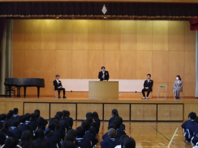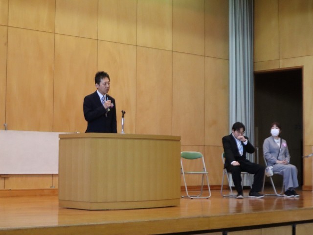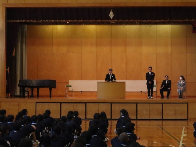 本日、今年度で鑓水中学校を去られる先生方の離任式を行いました。離任する教員から、鑓水中学校で過ごしたみんなとの思い出や、生徒へ向けたメッセージを伝えました。その後、代表生徒から花束が贈られました。