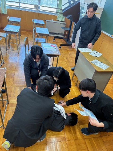 給食開始前に職員のアレルギー対応研修を行いました。アレルギー症状の出た生徒役、授業者役、隣の教室の授業者役、生徒役等になり、5時間目の授業中に、ある生徒にアレルギー症状が出た、という設定でロールプレイをしました。救急車を要請するタイミングや、エピペンを打つ判断をする状況等を確認しました。