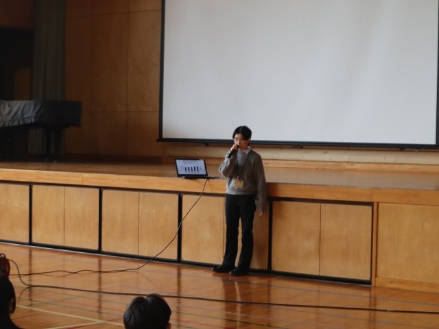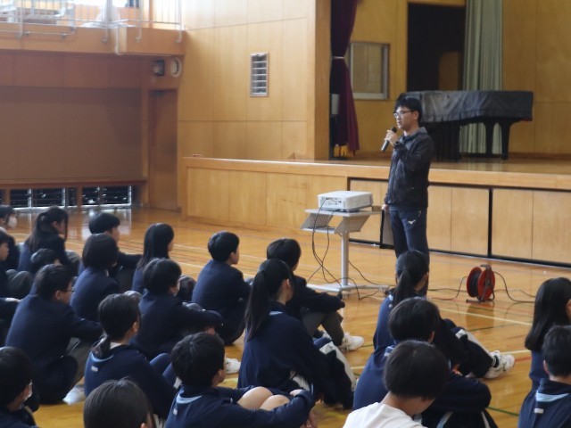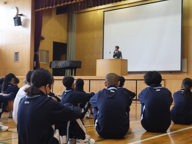 続いて生活指導主任の松本先生から「いじめの定義(言葉や行動、インターネット等を通じて相手の心や体を傷つけ、『された子がつらい・こわいと感じているもの』すべてを指します。)」を確認し、あらためて「『想像力』と『思いやり』を発揮してほしい」と全校生徒に訴えました。