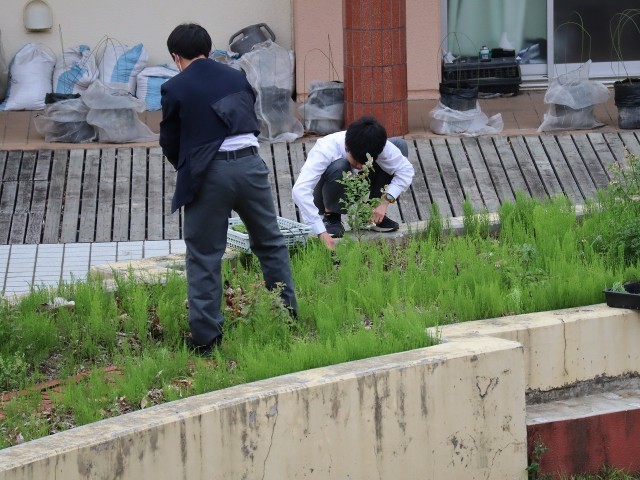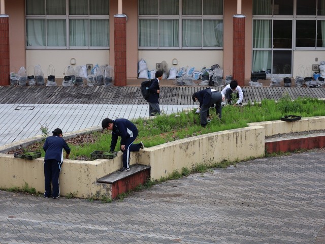 令和7年度よりPTAから生徒会に、より良い学校生活を目指すための環境改善費(年間5万円)をいただいています。この環境改善費で、生徒会は「中庭の花壇にブルーベリー畑を作り、鑓水中学校の象徴の場の一つとする」ことを決議し、実施していますが、そのブルーベリー畑に雑草が生えてきたので、生徒会本部役員と有志生徒が草を抜きました。