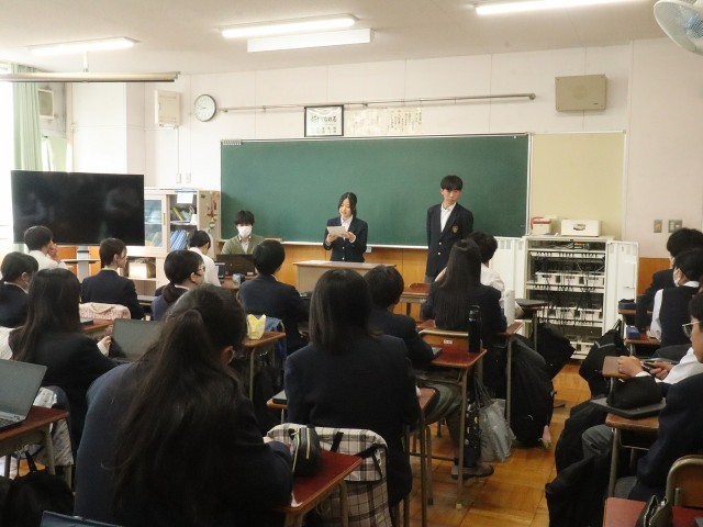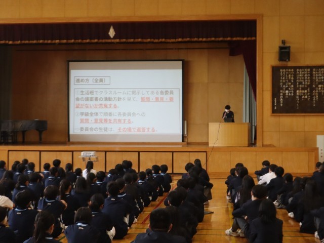 4月の生徒朝会を実施しました。生徒朝会では各委員会の委員長の紹介と、議案書討議の仕方について生徒会本部役員より説明しました。その後、各クラスで議案書討議を行いました。