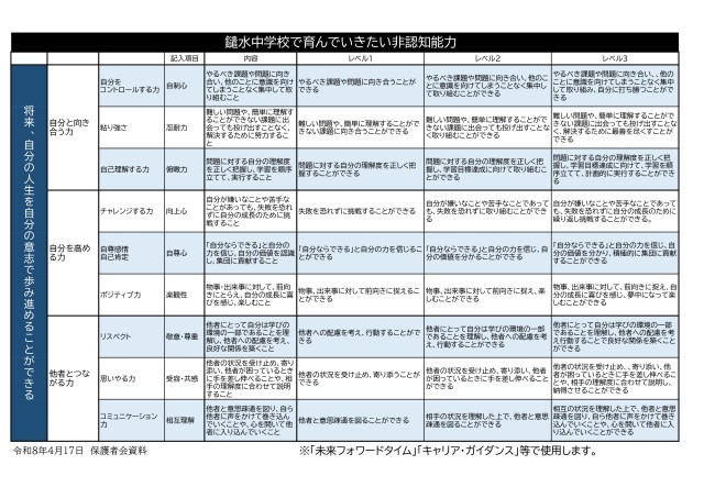 学期始めのキャリアカウンセリングを行っています。「鑓水中学校で育んでいきたい非認知能力」から生徒自身が伸ばしたい「非認知能力」を選び、具体的な目標を設定しました。キャリアカウンセリングでは、担任の先生と、その目標について適切かどうか、具体的にどのように行動するのか等を対話を通して深めました。4月24日(金)まで実施しています。