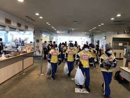 朝、部屋を出る前に、美化係の担当の生徒が細かく部屋をチェックし『来る前よりきれいにしてして帰る!』をしっかり行っていました。写真はチェックに合格した後、バスに向かう様子です。