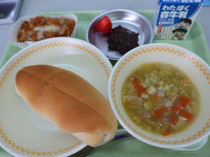 献立:セルフココアクリームサンド、ポテトのミート焼き、ABCスープ、いちご