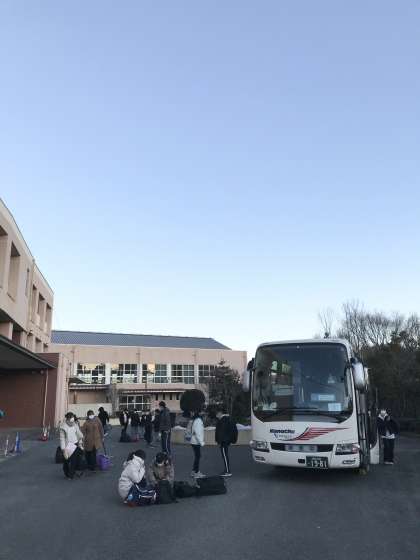 晴天に恵まれた1年生のスキー移動教室が始まりました。全員元気に集合し、鑓中を出発しました!
