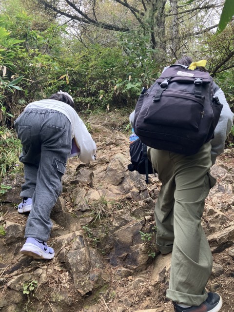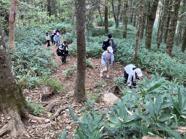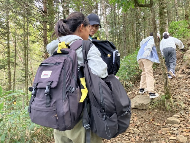 頂上まであと一息です!険しい道のりが続きますが、仲間と支え合いながら、一歩一歩確実に進んでいます。中には、辛い子のリュックを待ってあげる優しい子もいました。最後の力を振り絞って頑張りましょう!