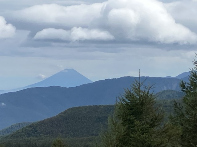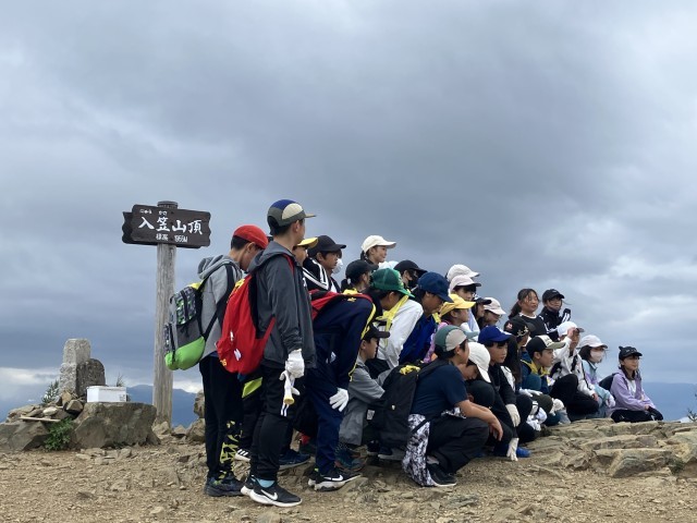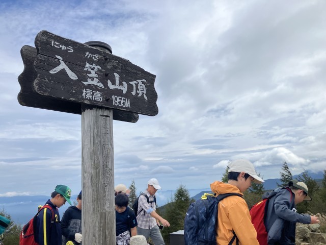 入笠山の頂上に到着しました。みんな、満足感と安心感に満ちた表情を浮かべています。遠くに富士山も見ることができました。頑張って歩いた分、頂上からの眺望は最高でした!