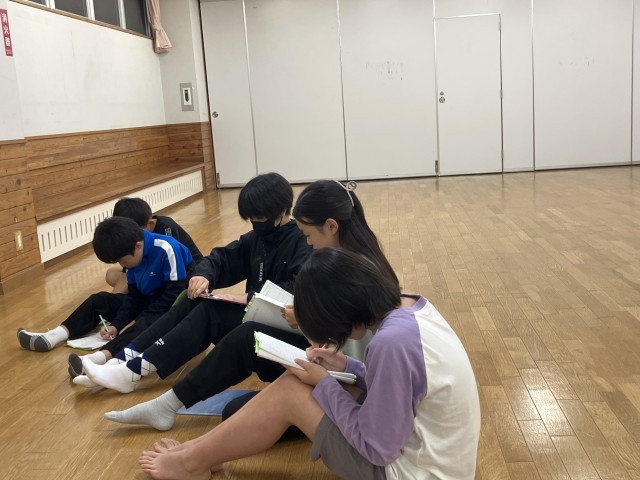 班長・室長が集まり、今日の反省や良かった行動を振り返るとともに、明日の準備について確認しています。子供たちの真剣な表情から、確かな成長を感じます。