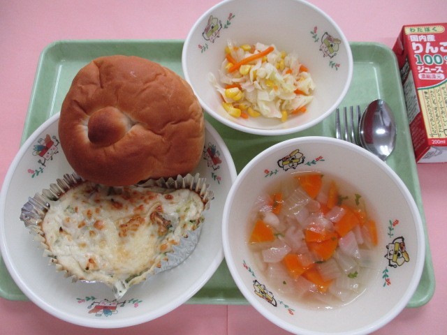 10月8日(水)ミルクパン、白身魚とポテトのグラタン、白いんげん豆のスープ、フレンチサラダ、りんごジュース