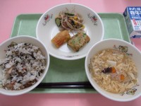 10月15日(水)わかめと麦のごはん、たまご焼き、豚汁、野菜のおかか和え、くだもの(みかん)、牛乳
