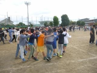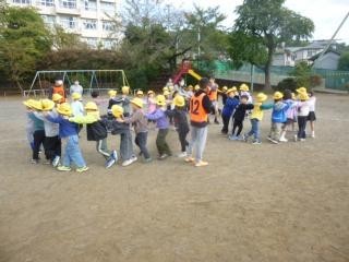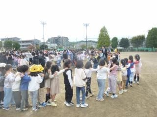 今日の集会は「ジャンケン列車」をしました。音楽が止まったら近くの人とジャンケンをして、負けた人が勝った人の後ろにつきました。ジャンケンを繰り返すうちに、とても長い列車ができました。
