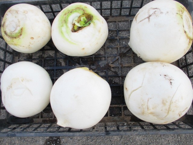 今年も聖護院大根は大きく育ちました。葉の部分も加えて旬のほうれん草と一緒においしくいただきました。