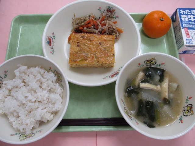 1月20日(火)麦ごはん、ぎせい豆腐、野菜ののり和え、ほうれん草のみそ汁、くだもの(みかん)、牛乳