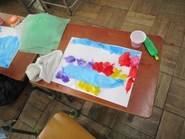 でんぷん糊を水で溶かして色々な形のお花紙を貼りました。