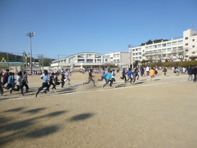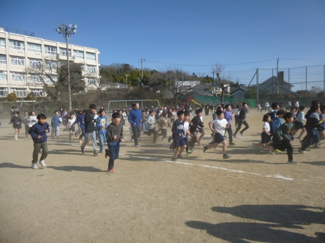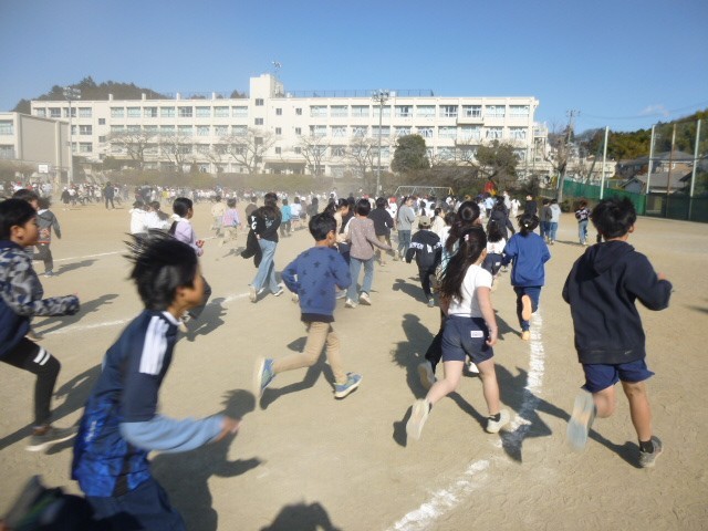 今日は持久走週間の最終日です。中休みに全校児童が校庭で持久走に取り組みました。今日は寒さが少し緩み、心地よい日差しのもと、子どもたちは自分のペースで意欲的に走っていました。