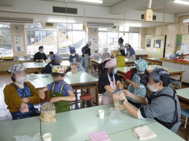 本日の学校公開の午後、PTA主催の「味噌作り」を行いました。事前に申し込んだ児童と保護者が家庭科室で、大豆から味噌を作る体験をしました。ゆでた大豆をチャック付きのビニール袋に入れて、空気を抜いてつぶし、塩と麹を入れてよく混ぜました。これを常温で数か月置くと、おいしい味噌ができるそうです。