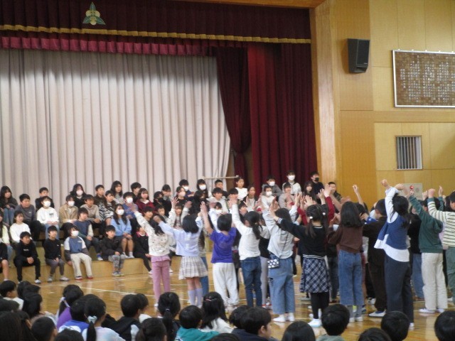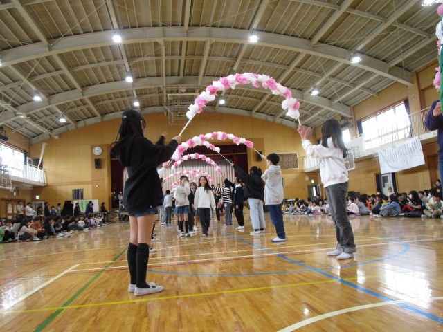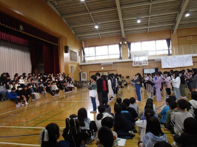 「6年生を送る会」を開催しました。各学年から6年生の卒業をお祝いする出し物を披露しました。どの学年の出し物も、「卒業のお祝い」「これまでの感謝」「進学へのエール」のメッセージが込められていました。出し物のお礼に6年生が合奏を行うと、アンコールが沸き上がり、会場が拍手と笑顔で包まれました。全員の心と心が通い合う素敵な会になりました。