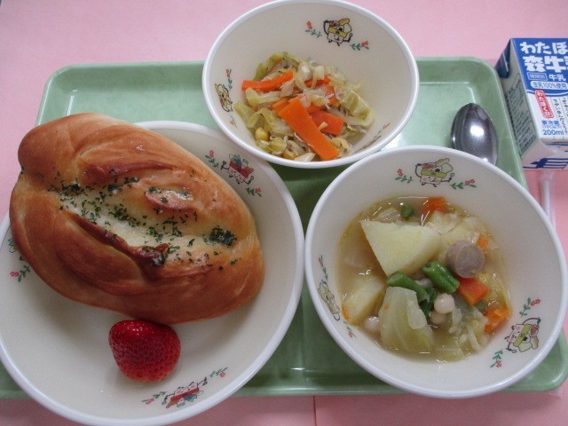 3月13日(金)ガーリックトースト、野菜と豆のポトフ、じゃこサラダ、くだもの(いちご)、牛乳