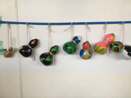4月からタネを撒いて育てていたヒョウタンは、立派に成長して各クラス7個ずつに分けられました。それに色をつけてヒョウタンアートにしました。三階の廊下に飾ってあります。
