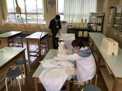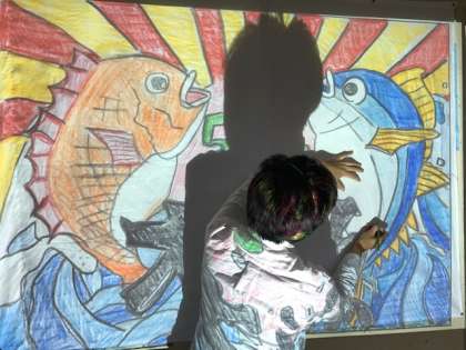 ソーラン節で使う旗の準備をしました。買ってきた布を縫って、子供たちが描いた絵を布に写しました。色塗りは、実行委員の子供たちが中心となって行います。