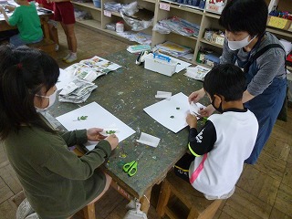 それぞれに探してきた草を図工の材料にして、作品作りスタート。