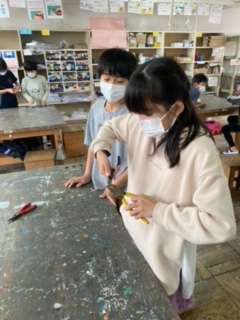 5年生の針金工作です。早いクラスでは、針金の土台に針金をつなげて、形をつくっています。