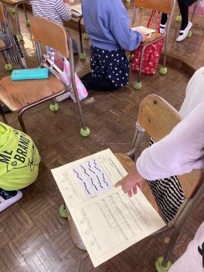 せんりつのとくちょうを感じ取って歌う『とどけようこのゆめを』の1時間目です。せんりつを図形で表した図形楽譜クイズに挑戦しています。