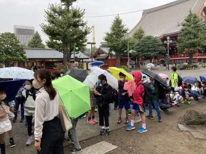 途中渋滞にはまってしまい、15分遅れて到着しました。さらに、バスから降りると雨…。そんな中、有名な雷門や仲見世通り、宝蔵門、五重塔、本殿と雰囲気を楽しむことができました。