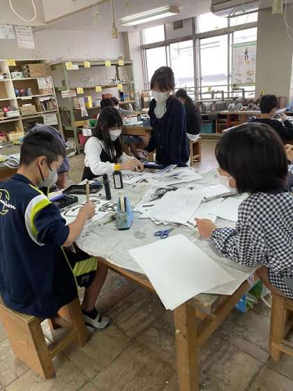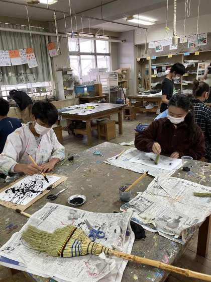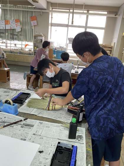 初回は、ホウキ(きれいに洗ってあります)を切って、ホウキ筆をつくってかいてみました。
