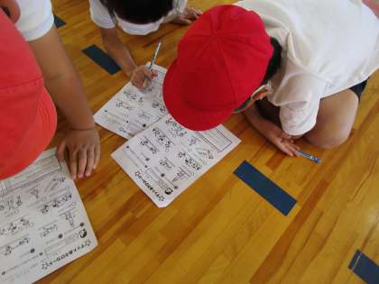 かえるの足打ちや動物歩き、ゆりかごなど様々な動きをやり、友達と楽しく取り組みました。