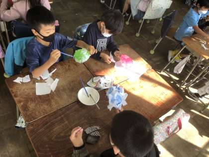 蚕の糸取りに向けて、風船に洗濯糊で半紙を貼り付けて、球体のランプシェードづくりに取り組みました。