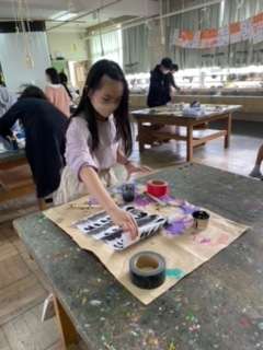 展覧会では、共同作品の「昇り龍」を吊るします。龍のうろこを全員でつくりましたが、体に付けてみたら数が足りませんでした。