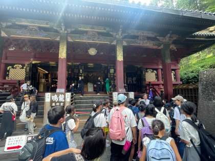 鳴龍を体験しました。不思議な音に耳を傾けていました。次は華厳の滝に向けていろは坂を上ります。