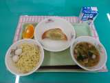 今日は八王子市のご当地グルメ「八王子ラーメン」です。給食では野菜たっぷりのスープにめんをつけて食べる“つけめんスタイル”でいただきました。スープにはきざみたまねぎがたっぷり入っています。
